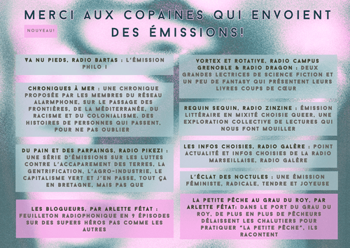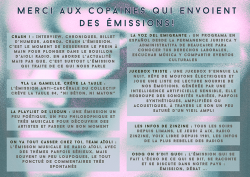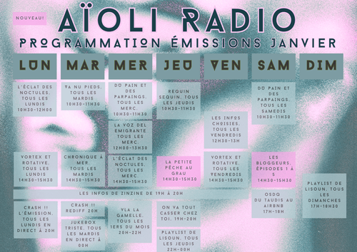 Ça y est, on est en 2025 et Aïoli a concocté une grille de programmation haute en couleurs : on y écoute de la musique du désert, on y découvre le collectif Urgence Palestine, on se laisse surprendre par une fiction sonore, on y retrace l’histoire des luttes urbaines à Marseille et des travailleureuses détachées, on y parle du livre Technopolice ou encore d’ethnomusicologie, on décortique France Travail et on y fait la cuisine, un petit échantillon d’une programmation qu’on ne se lasse pas de vous partager !