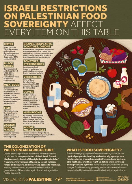 Une image de Visualizing Palestine sur la souveraineté alimentaire en Palestine, bien avant cette nouvelle année de guerre (mai 2022) :